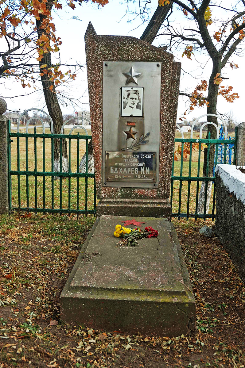 По архивным документам ЦАМО в этом хуторе был захоронен Герой Советского Союза старшина Песков Дмитрий Иванович: ЦАМО Фонд:58, Опись:18001, Дело:647, Стр 06. Первоначальное место захоронения старшины Пескова Д. И. можно посмотреть на карте М-36-104-V а также на фрагменте довоенной топографической карты М-36-104-G масштаба 1:50 000. Место захоронения отмечено на карте цифрой "58 Б". Его-то останки и были перезахоронены у братской могилы с. Пришиб. Подробнее об истории этой ошибки можно прочитать здесь:Peskov/Bacharev-Peskov.html