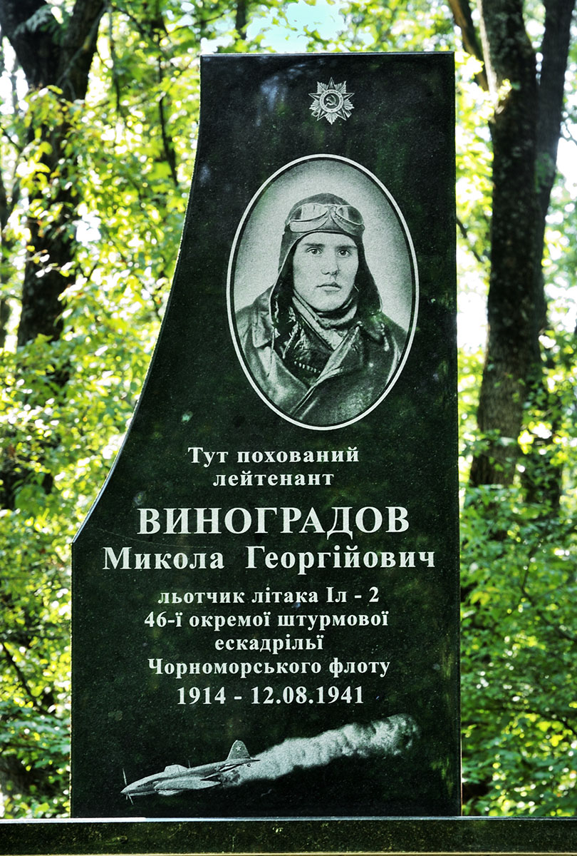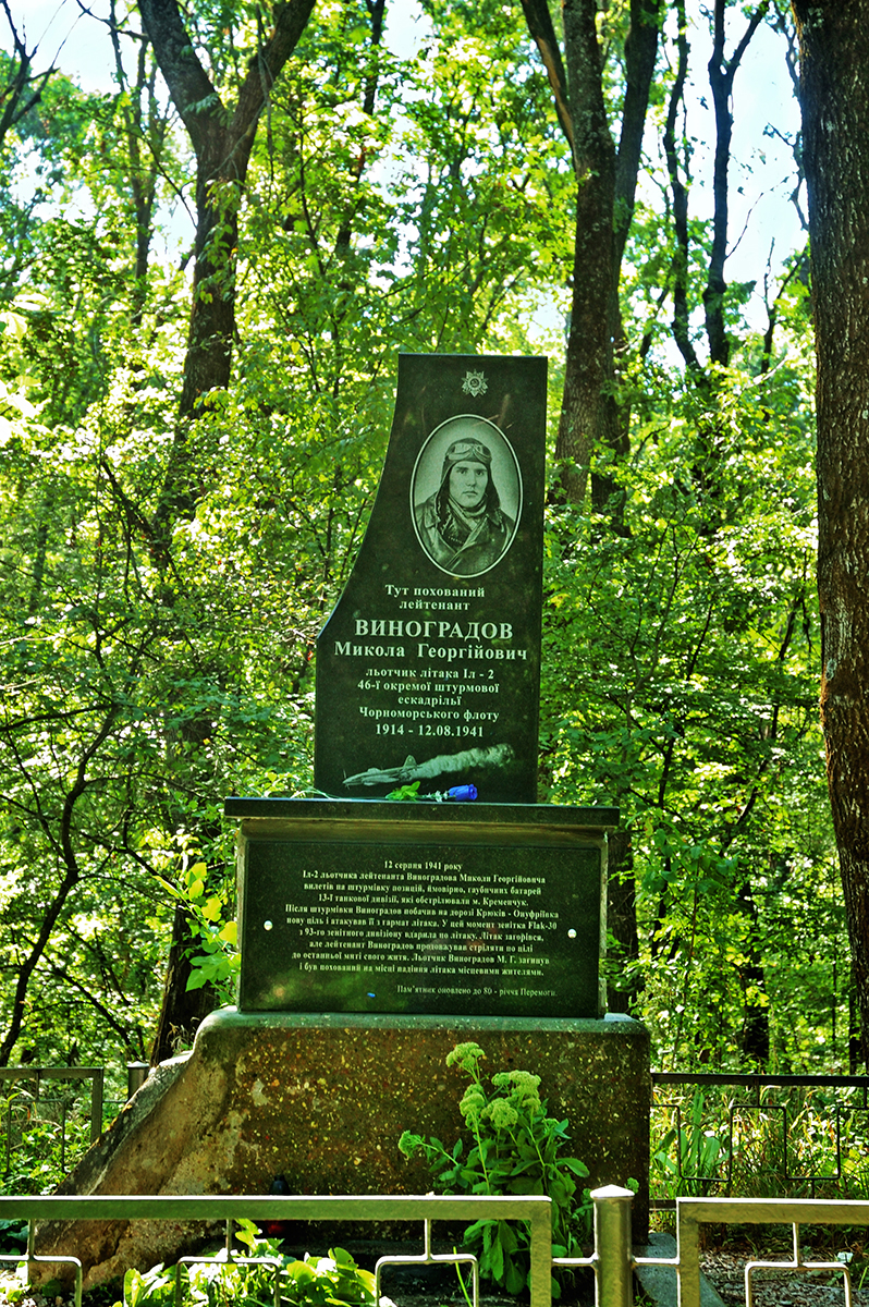 Об обстановке, которая сложилась на Кременчугском направлении в первых числах августа 1941 года можно почитать здесь: 6 августа 1941 года. P.S. В 2009 году на могиле лётчика 46-й отдельной штурмовой эскадрильи Черноморского флота был установлен новый памяткик. На нём высечены уже правильные данные летчика - Виноградов Николай Григорьевич. Установленый в 2009 году был разбит нацистскими варварами. Часть уцелевшей мемориальной плиты была частично восстановлена и снова установлена на пьедестале. В усечённом виде памятник простоял до 2025 года. В 2025 году в Израиле нашлись прямые родственники лётчика, которые прислали нам несколько хороших фото Виноградова Н. Г. В связм этим событием было решено полноценно восстановить памятник: заменить плиту с неверным содержанием событий августа 1941 года и полностью заменить мемориальную плиту добавив на неё портрет лётчика. 4 сентября 2025 года кременчугская фирма "Мир камня", под непосредственным руководством владельца фирмы Араика, установила на могиле погибшего лётчика новый памятник. Памятник изготовлен и установлен на средства родственников Виноградова Н.Г. Теперь памятник на могиле лётчика выглядит так: