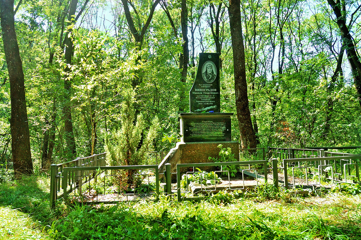 Могила лётчика лейтенанта Виноградова Николая Георгиевича находится в Деевском лесу южнее Крюкова. (Правобережная часть г. Кременчуга) Координаты по GPS: N 48.59,59,6469 E 33.26,2460. Карта V-36-103-Il-2. Месторасположение братской могилы помечено на карте цифрой"13". Впервые я попал на могилу лётчика Виноградова в начале 60-х, когда с пацанами "бастовали" школьные уроки. Тогда она выглядела скромным, заросшим травой холмиком, с крестом в головах, сваренным из железных труб. На могильном холмике, сквозь траву, голубели ирисы, высаженные по старой сельской кладбищенской традиции. О лётчике в те времена я знал только то, что погиб он в 41-м году. Его самолёт был подбит над Кременчугом и упал сюда, в Деевский лес. Местные жители рассказали, что видели как в Деевский лес падал горящий самолёт. Первыми к самолёту приехали немцы. Место падения было оцеплено, и только на третий день, когда немцы уехали, жители с окраины Крюкова смогли похоронить лётчика здесь же, рядом с местом падения самолёта. Крупные фрагменты самолёта, очевидно, вывезли немцы. В начале 60-х я помню лишь небольшие, уже сильно ржавые "железки", не представляющие для нас, пацанов, никакого интереса. К 20-летию Победы вместо креста установили железобетонную плиту со звездой вверху. На плите надпись: "Здесь похоронен лётчик Виноградов Николай Корнеевич. 1914-1941". Вокруг памятника поставили скромную железную оградку. Малоприметная тропинка к одинокой могиле со временем превратилась в лесную дорогу... Этот памятник простоял на могиле около 10 лет.